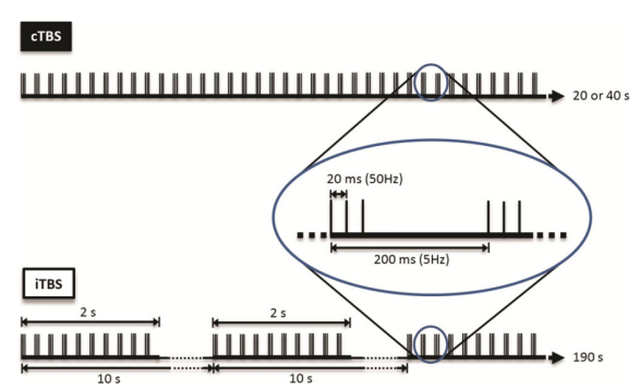 Repetitive transcranial magnetic stimulation (rTMS) can induce lasting changes in brain activity and cortical excitability, and it has been widely used in the treatment of psychiatric and neurological diseases. With the continuous development of TMS technology, researchers have developed more treatment modes. Theta burst stimulation (TBS) is a mode of repetitive stimulation, characterized by 3 pulses per cluster, an intra cluster frequency of 50Hz, and an intercluster frequency of 5Hz. Compared with traditional TMS, it has lower stimulation intensity, shorter stimulation time, and better stimulation effect. It's an optimized mode of stimulation.