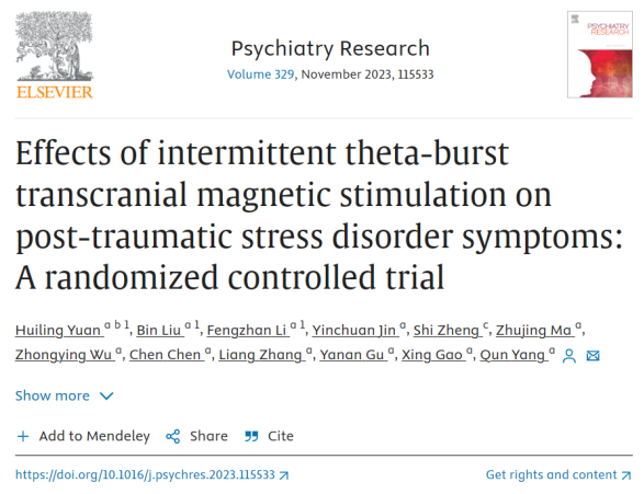 2.Reference:?Yuan, H., Liu, B., Li, F., Jin, Y., Zheng, S., Ma, Z., Wu, Z., Chen, C., Zhang, L., Gu, Y., Gao, X., & Yang, Q. (2023). Effects of intermittent theta-burst transcranial magnetic stimulation on post-traumatic stress disorder symptoms: A randomized controlled trial. Psychiatry research, 329, 115533. https://doi.org/10.1016/j.psychres.2023.115533